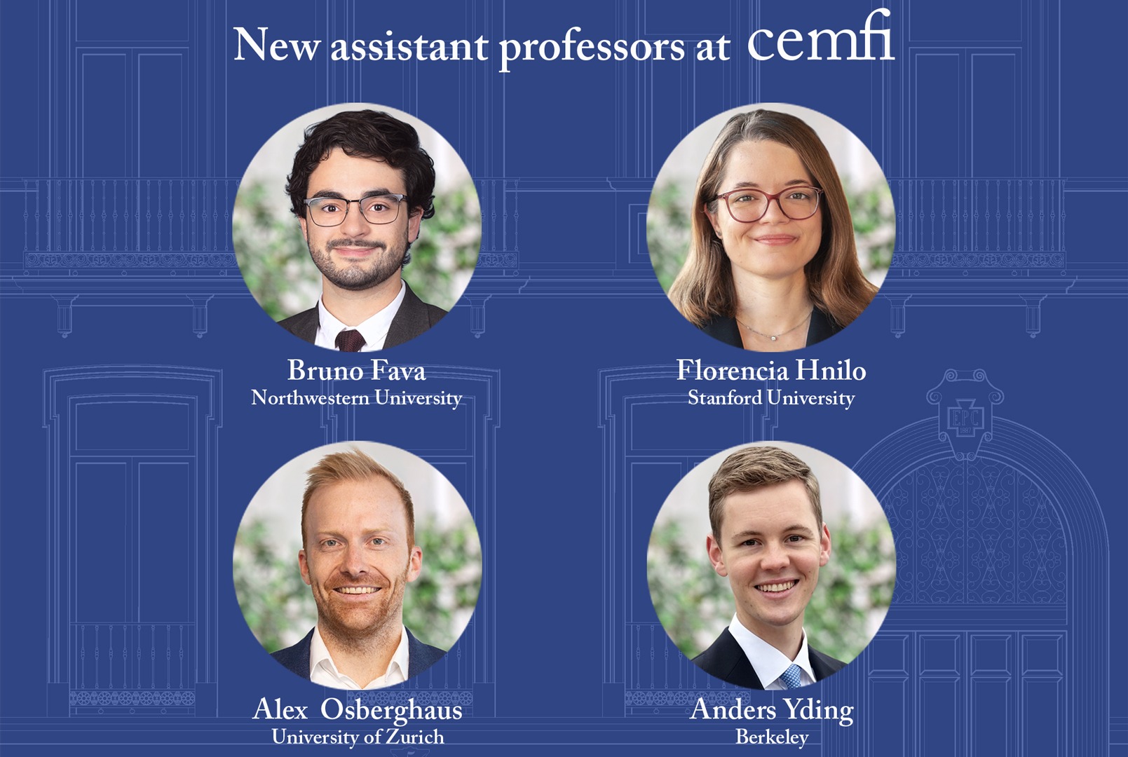 We are very pleased to welcome four new assistant professors at CEMFI: Bruno Fava (Northwestern University) in econometrics; Florencia Hnilo (Stanford University) in economic development and economic history; Alex Osberghaus (University of Zurich) in financial economics; and Anders Yding (Berkeley) in macroeconomics. Bruno and Anders will join CEMFI after one-year postdoc positions at the University of Chicago and Columbia University, respectively.